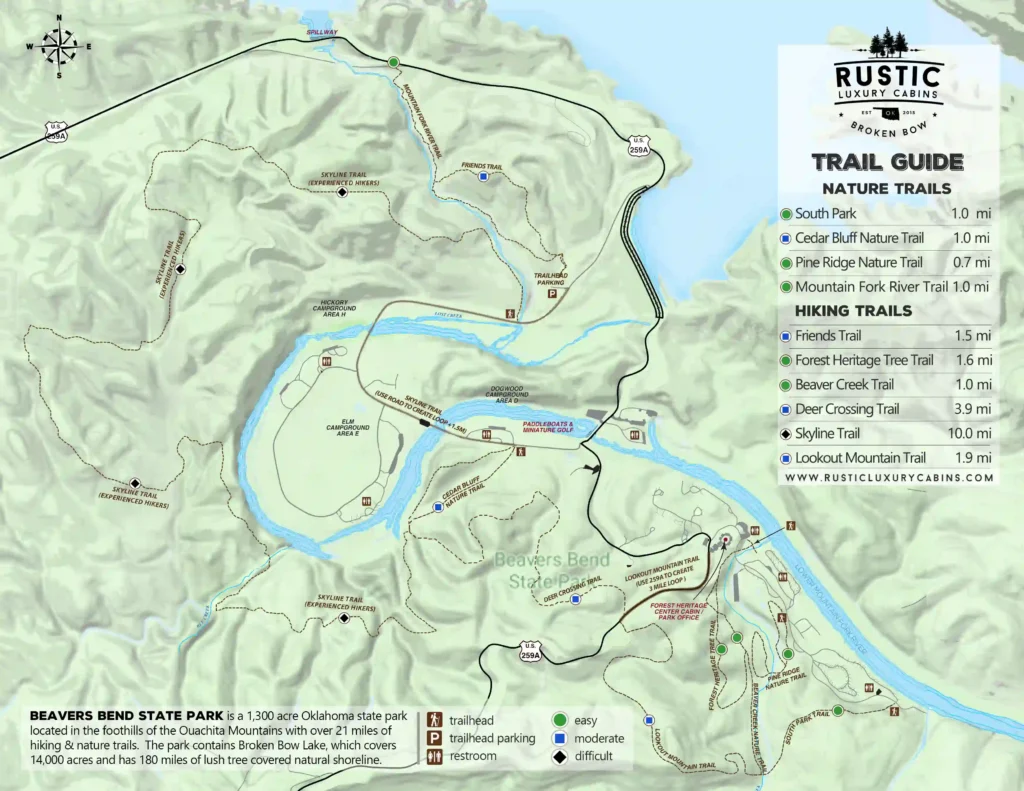 Discover the best hiking trails in Broken Bow and Beavers Bend State Park with our comprehensive guide. Whether you’re seeking scenic trails, expert recommendations, or detailed maps, this page has everything you need for an unforgettable outdoor adventure. Explore our curated trail guides that showcase the park’s breathtaking landscapes, from serene riverside walks to challenging mountain hikes. Be sure to check out our trail map and get insider tips to make the most of your hiking journey in this popular Oklahoma destination. Plan your next adventure today with our ultimate Broken Bow hiking guide!